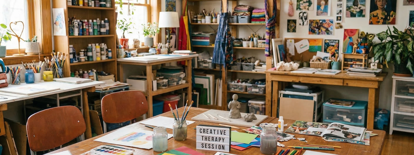 ‘De mensen die ik begeleid hebben uiteenlopende redenen om mijn hulp in te schakelen. Ze zijn bijvoorbeeld stukgelopen in hun werk. Er kunnen fysieke klachten zijn, maar ook emotionele problemen. Mensen zoeken ondersteuning bij een scheiding of verlies van iemand. Of ze ervaren geen zingeving. Van alles kan aanleiding zijn voor zelfonderzoek. De opdrachten die ik geef, zijn afgestemd op de persoon en de klacht. Iemand met rouwverwerking laat ik bijvoorbeeld nat op nat schilderen. Dat is vergelijkbaar met huilen op papier. Iemand die op zoek is naar kracht geef ik bijenwas om mee te tekenen of we gaan met klei aan de slag. Alle materialen die kunnen werken, zet ik in.’